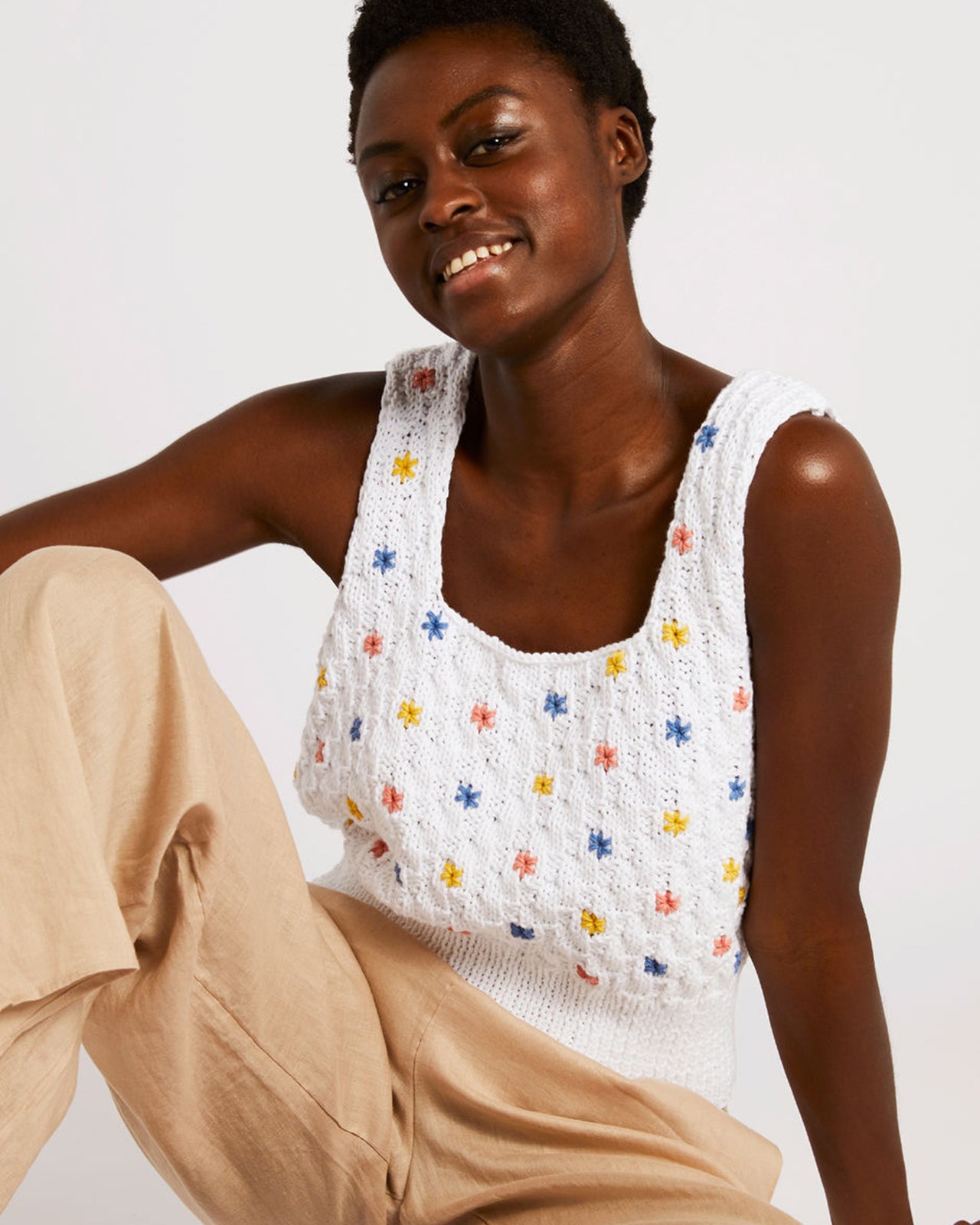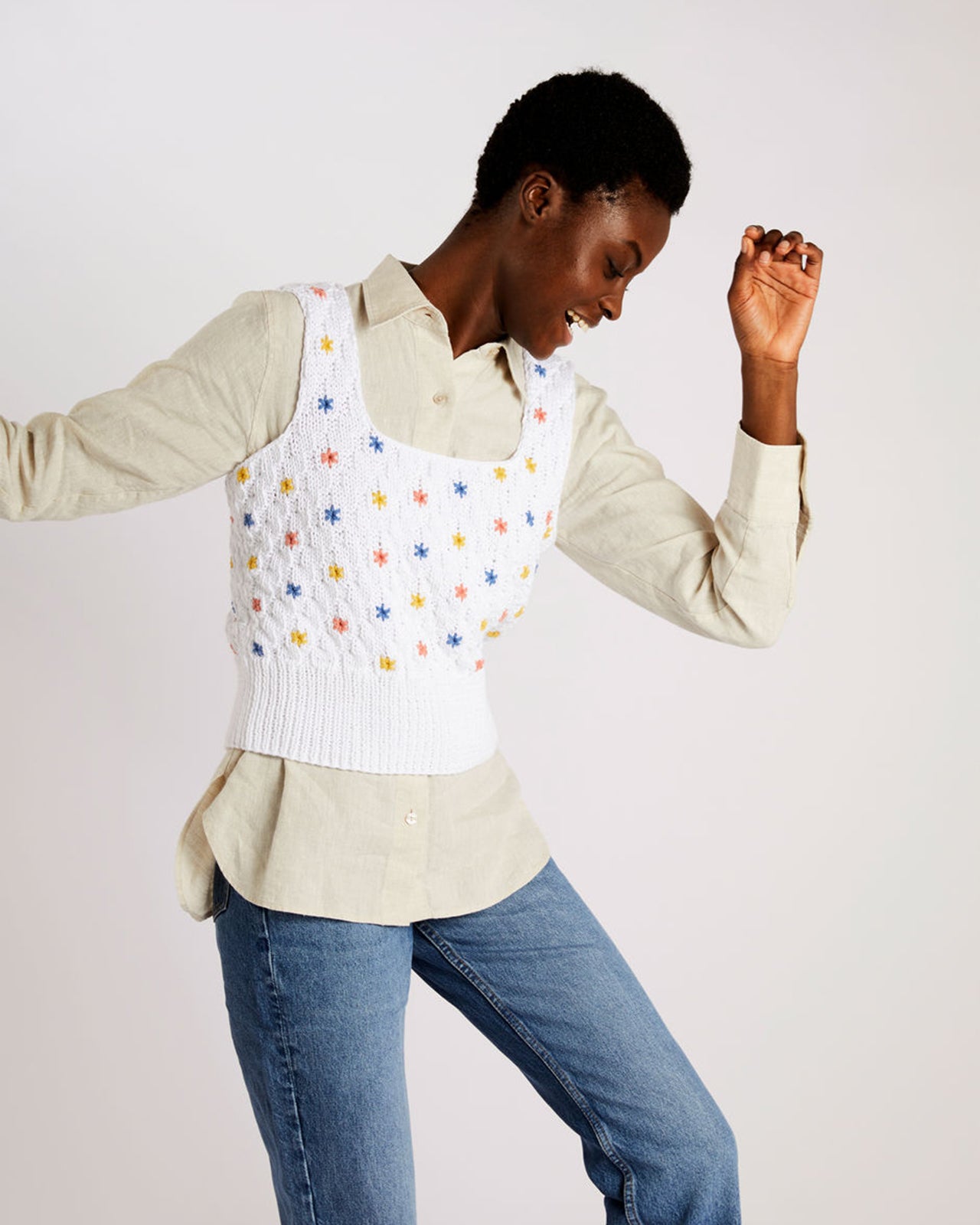 この夢のようなDAISY VESTは、超簡単なダイアゴナルステッチを使って編みます。