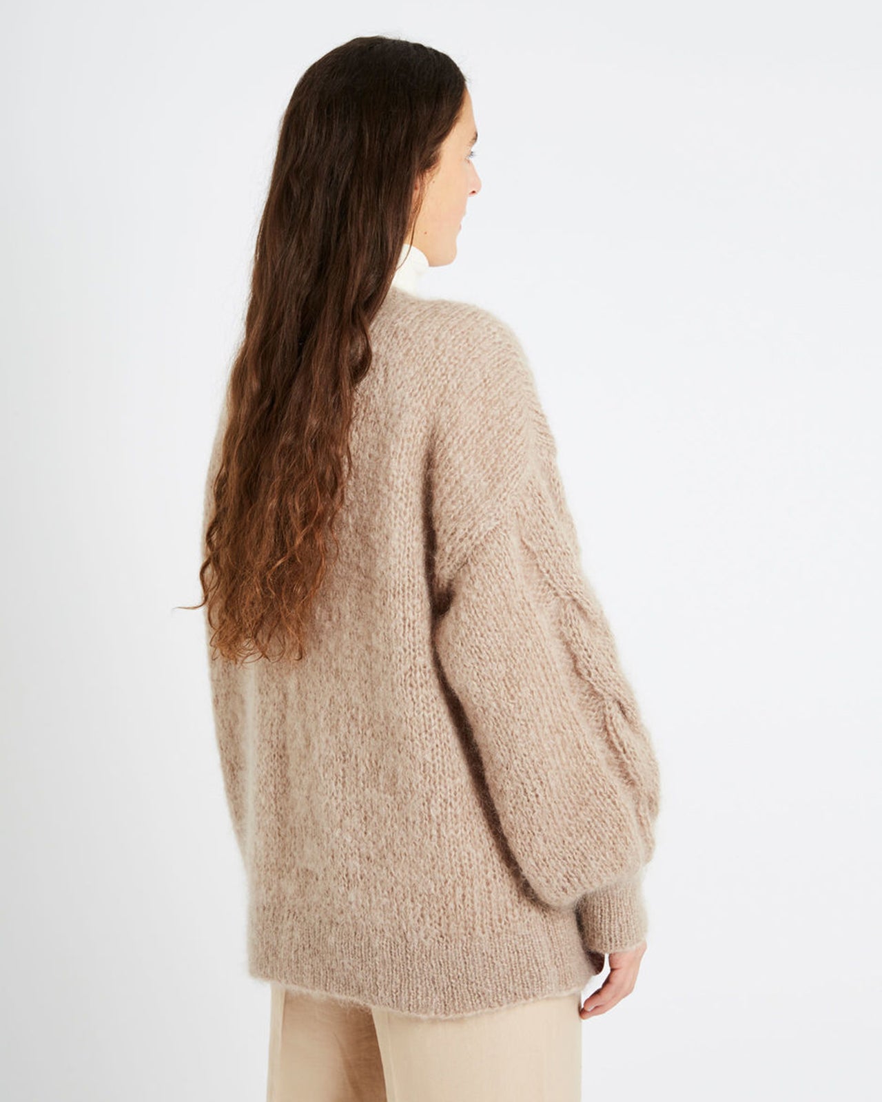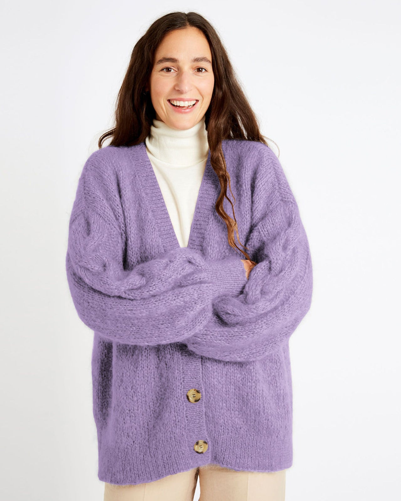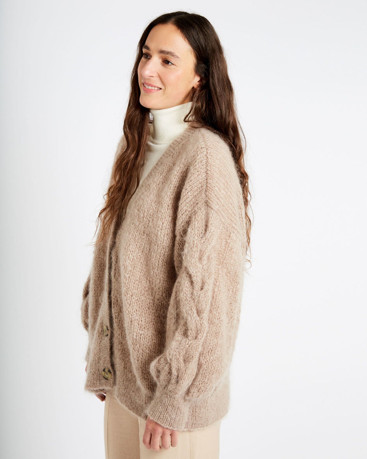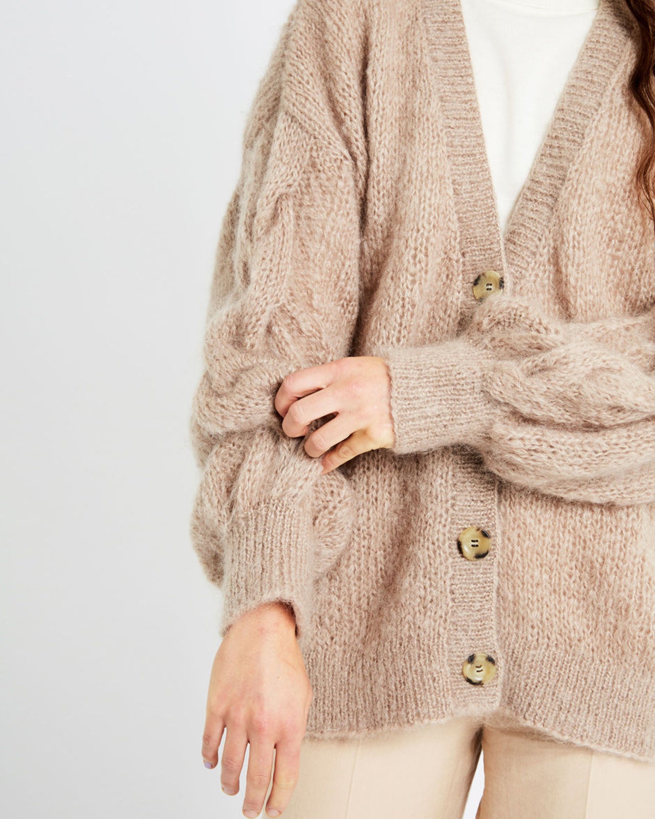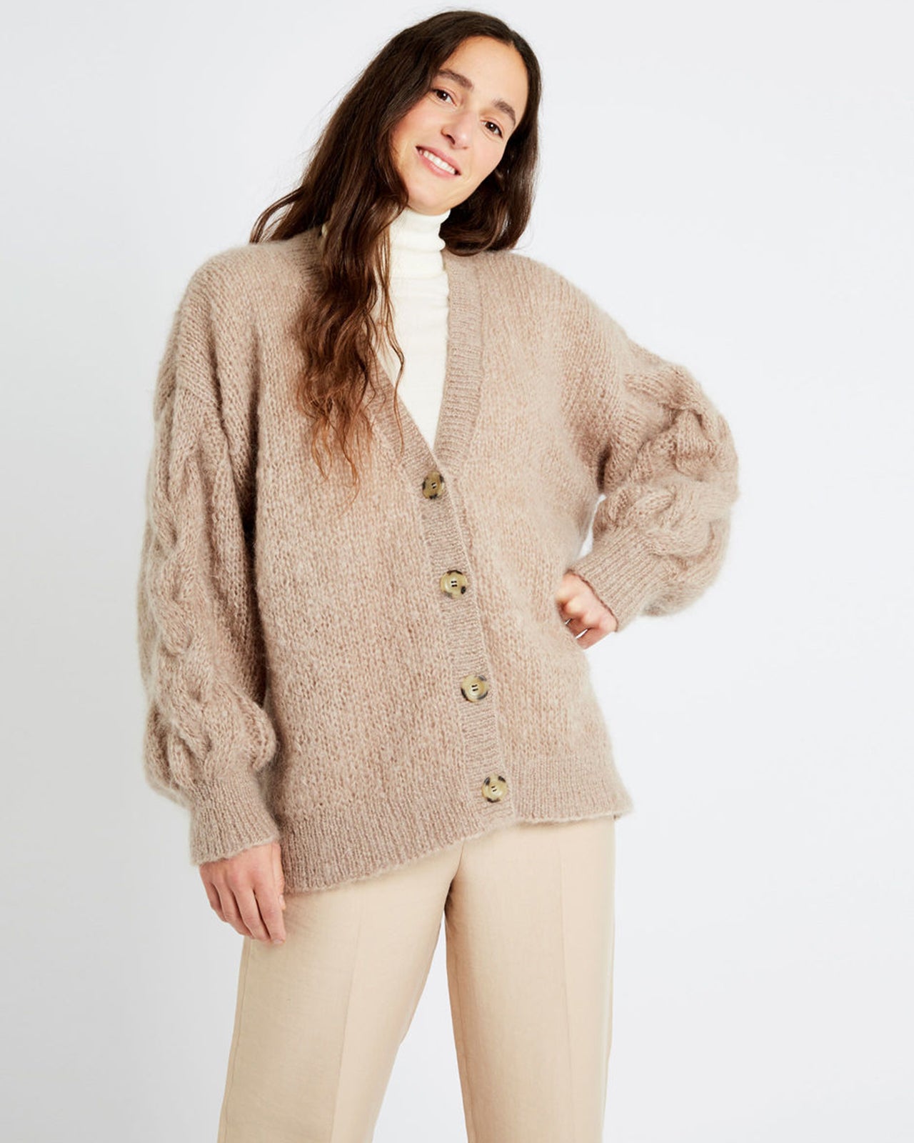 ゆったりとしたオーバーサイズのフィット感、ケーブル編みの袖、ボタンアップ