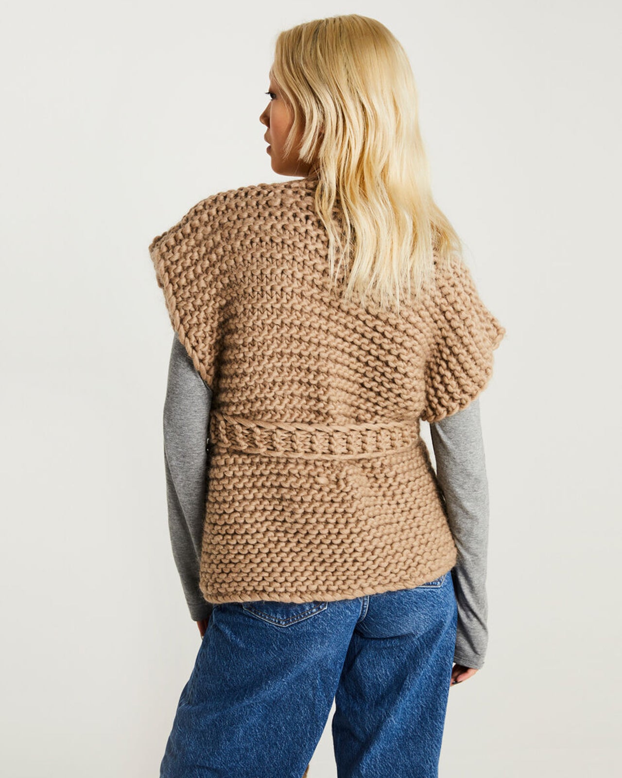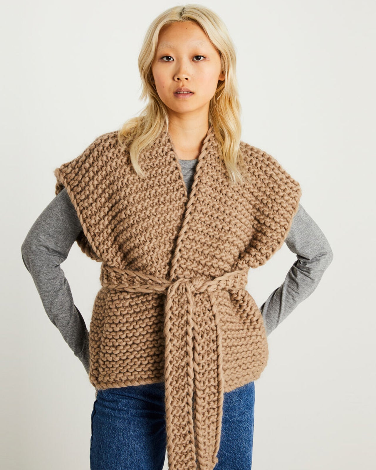 すぐに編め、おしゃれなベルトタイで仕上げることができます。