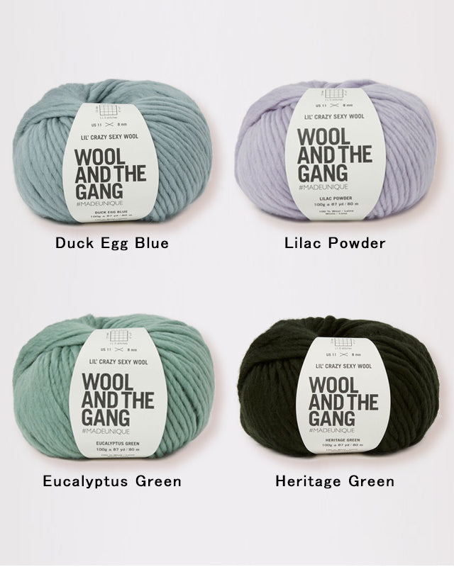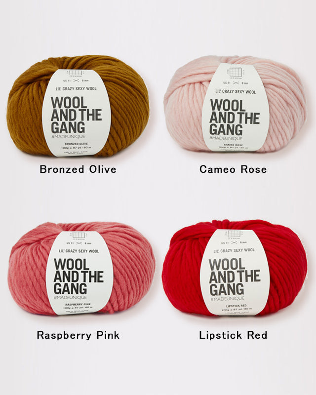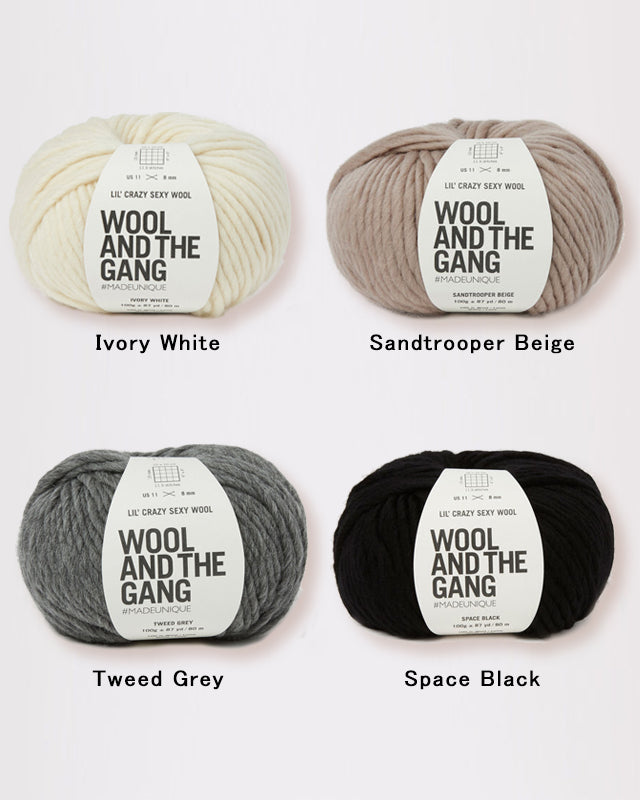 Wool and the Gangのアイコン、Crazy Sexy Woolにかわいい妹ができました。同じ超ソフトなペルー産ウールから紡いだLIL' CRAZY SEXY WOOLも太めの毛糸ですが、オリジナルよりも少しだけ太さを抑えています。そして、肌触りがよく、通気性に優れ、伸縮性に富んでいます。初心者の方にも手に取りやすく、上級者の方にも可能性を秘めた、冬の作品に重厚感を与えるスーパークールなウールです。