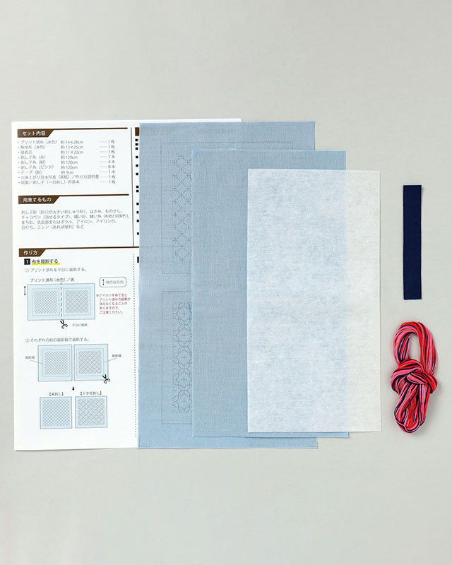 図案プリント済み布、刺し子糸、接着芯、作り方説明書など
