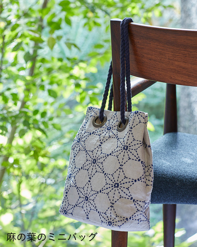 生地に印刷された図案に沿ってひと針ひと針丁寧に刺しすすめると、美しい文様が浮かび上がってきます。 すべてのバッグに「大槌刺し子」オリジナルタグ付き。
