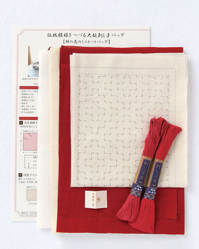 図案プリント済み布、布、刺し子糸、接着芯、パーツ類、作り方説明書など