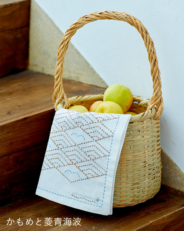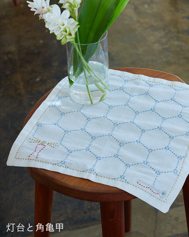 東日本大震災の避難所から発足した岩手県大槌町の大槌刺し子さんと共同開発した刺し子ふきん。