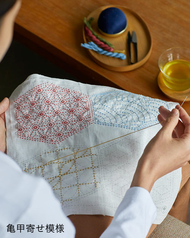 刺し子針(針穴が大きい刺しゅう針)、はさみ、ものさし、縫い糸(布と同系色)、縫い針、目打ち,チャコペン(消せるタイプ)、アイロンなど