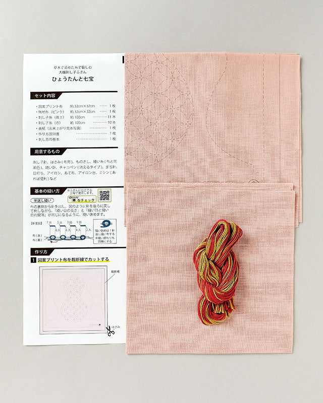 図案プリント布、無地布、刺し子糸、作り方説明書など