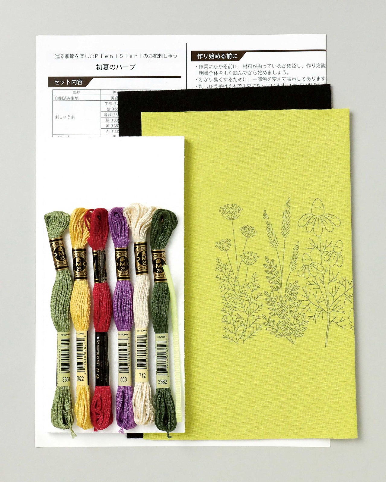 図案プリント済み布、刺しゅう糸、発泡パネル、フェルト、リボン、作り方説明書