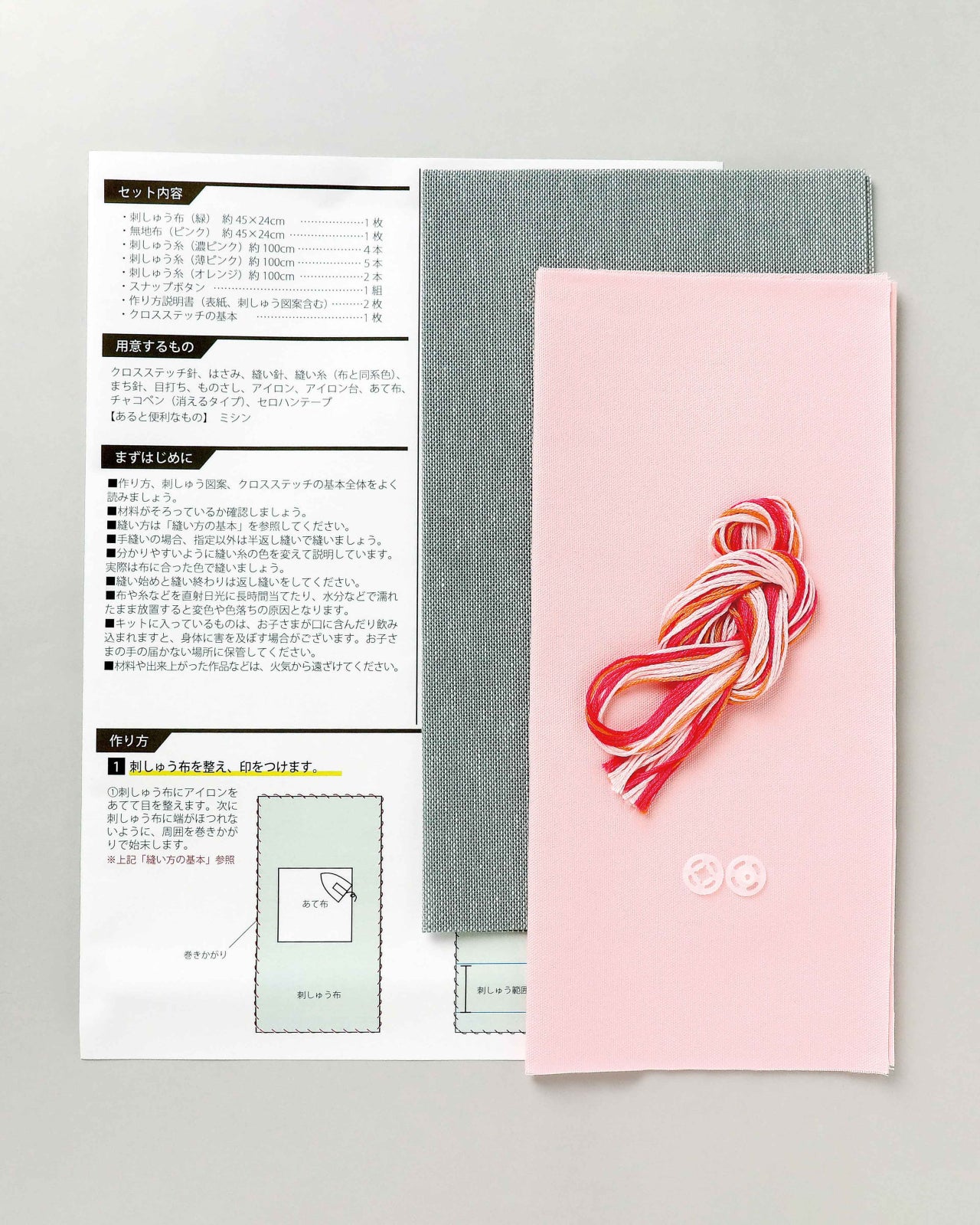 クロスステッチ布、刺しゅう糸、無地布、パーツ類、作り方説明書など