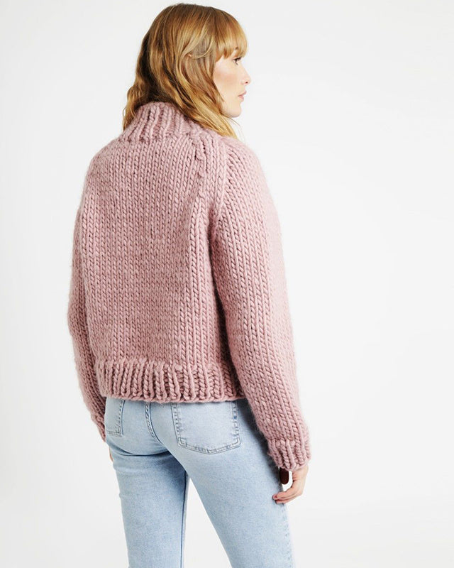 メリヤス編みとゴム編みで作るこの中級者向けのセーターは、ハイネックラインと