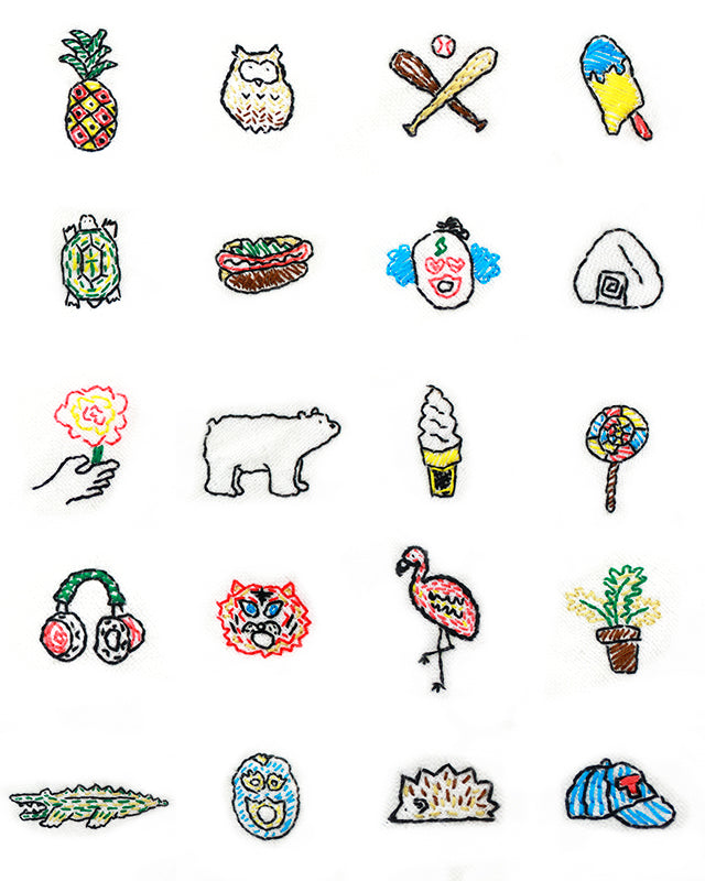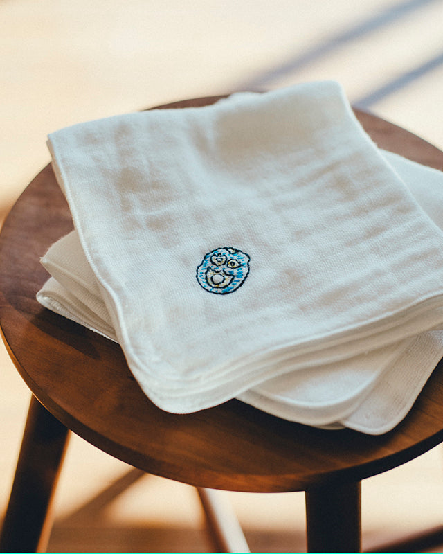 ふわふわのガーゼのハンカチと、ゆるーい20個の図案、刺しゅう糸がセットされたキットです。