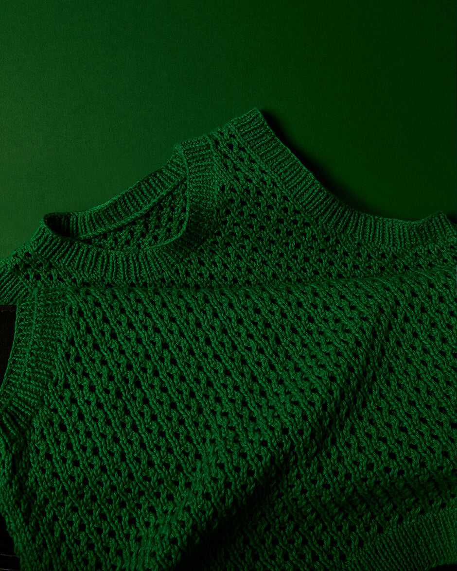 1目ゴム編みとパンチホールステッチで編む透かし編みが素敵な