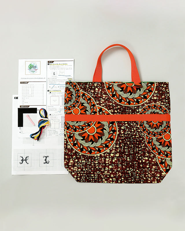 アフリカンプリントバッグ 刺しゅう布 刺しゅう糸 クロスステッチ針 縫い針 まち針 図案 作り方説明書など